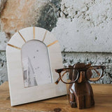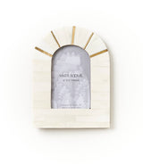 Expanding the Mukhendu Collection this hand carved picture frame features ethically sourced, cruelty free bone tile in a arch shape with brass accents. For convenient display this photo frame features a one-way table top easel. Frame accommodates 5.5x3.5 photo or print, easily accessed with metal swivel tabs and removable back. Frames in various shapes, sizes, designs and colors, can be displayed together to make a unique gallery wall display. Dimensions:Overall 8.5"L x 6.5"W; Photo opening 5.5"L x 3.5"W. All of Matr Boomie's collection is handmade, fair trade and sustainable.