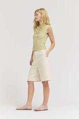 Effortless and airy, this sleeveless top features delicate shirring at the neckline and a charming lettuce hem for subtle texture and movement. Crafted in a soft chartreuse hue, the lightweight fabric blends 95% polyester with 5% spandex for comfortable stretch and easy care. Perfect for layering or wearing solo during warmer months.