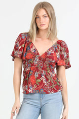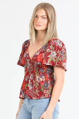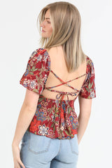 This blouse showcases a strappy back design and a V-neckline, both enhanced by a stunning floral print.