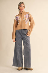 Meet your new favorite layering piece! This taupe cardigan sweater features the sweetest pink floral print and a cozy ribbed collar. Full zip design means easy on, easy off. Leave it unzipped or turn it into a quarter zip with a white tee underneath!
