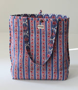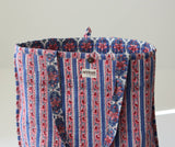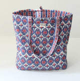 This cotton tote was made in India, hand-block-printed and is reversible! A bag that makes an amazing gift! It is perfect size to fit a laptop. Quilting adds to the sturdiness. Size is 15" height x 15" width x 5" depth.