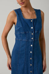 Step out in style with this playful Midi Denim Dress, perfect for fall layering or warm days on their own. Its button-down front adds a fun, flirty touch while the sleeveless design keeps things easy and breezy. The flattering midi length strikes the right balance between casual and chic, making it your go-to for pumpkin patch visits, weekend brunches, or cozy fireside hangouts. Durable denim and effortless design bring comfort and cool all season long.