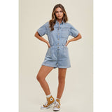DENIM UTILITY ROMPER - FUNCTIONAL BUTTONS, ELASTIC SIDE WAIST, POCKETS, RELAXED, CASUAL 100% COTTON