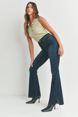 Elevate your style with our High Rise Outer Slit Flare jeans. These jeans feature a high rise waist and a subtle outer slit that adds a touch of sophistication. You'll love the flattering fit and sleek silhouette, perfect for any occasion. Upgrade your denim game today! 11'' Rise, 33'' Inseam, 22''