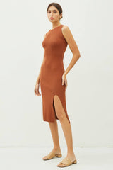 LEG SLIT BODYCON RIBBED KNIT MIDI DRESS