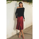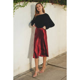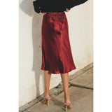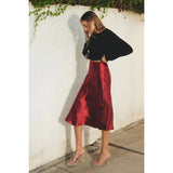 Expertly crafted in a rich merlot color, this A-line midi skirt adds a touch of sophistication to any wardrobe. The flattering silhouette and versatile color make it perfect for any occasion. Made with quality materials for long-lasting wear.