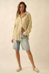 A stripe-print woven shirt with the following features: Collared neckline. Long sleeves with buttoned cuffs. Drop shoulder. Button-front closure. Chest pocket. Pleated yoke back. Curved shirttail hem. Oversized fit.