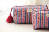 This pouch was made in India, hand-block-printed and makes a perfect travel bag! Comes with waterproof lining. Machine washable and tumble dry. Gets softer with every wash. ✤Due to the handmade nature of the print, small beautiful irregularities are natural and adds to the organic beauty of the product✤ - Large pouch is 10”x 4.5”x 4” - Medium is 8”x 4”x4” - Small pouch is 7”x 3”x3” Makes an amazing gift!