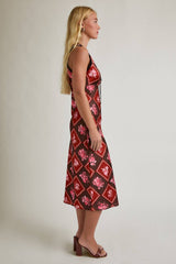 Swoon-worthy and oh-so-romantic, this midi dress perfect for date night. The flattering V-neck is beautifully framed with delicate black lace trim, while the luxe satin scarf print fabric adds a touch of vintage charm.