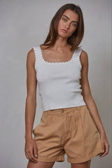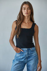 Effortlessly chic and oh-so versatile, this scallop lace-trimmed cropped tank is your new layering essential. Available in crisp white and classic black, it's the perfect peek-a-boo piece under sweaters and cardigans. The delicate scalloped edges add a touch of feminine flair, while the sleek cropped silhouette keeps things modern and flattering. Whether you're dressing it up or keeping it casual, this tank does the heavy lifting in your outfit rotation.