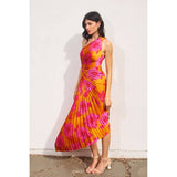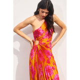 This Floral print satin pleated maxi dress boasts an expertly crafted asymmetrical design with a unique one shoulder style. The asymmetrical hem is complimented by a side keyhole detail and hidden side zipper closure for a sleek finish.