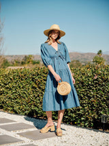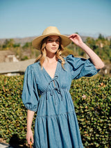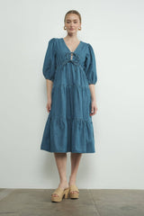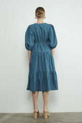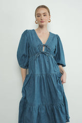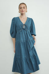 This denim midi dress a flattering V-neckline with a tied keyhole detail, adding a feminine touch. The dress has puffed elbow-length sleeves with elasticized cuffs, giving it a soft, romantic look. It is designed with a tiered, A-line silhouette, adjustable front ribbon tie