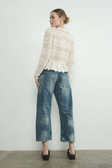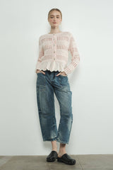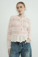 Classy and dainty, A Pointelle knit cardigan sweater featuring button-front closures, long sleeves, a round neckline, and lace ruffle trim. ensuring an elegant vibe.