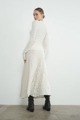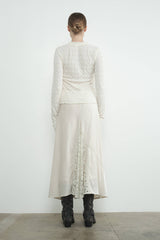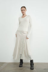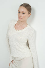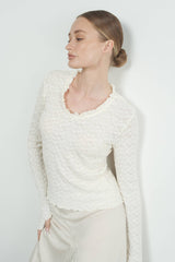 This long-sleeve lace top features a subtle floral pattern throughout, enhanced by a charming ruffle detail. The fitted silhouette gives a sleek, modern look, perfect for layering or wearing alone. Deep u neck detailed