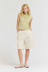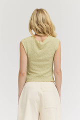 Effortless and airy, this sleeveless top features delicate shirring at the neckline and a charming lettuce hem for subtle texture and movement. Crafted in a soft chartreuse hue, the lightweight fabric blends 95% polyester with 5% spandex for comfortable stretch and easy care. Perfect for layering or wearing solo during warmer months.