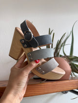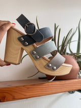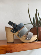 These lightweight clogs will give you all the height with the comfort you've been looking for! 3 tone blue straps and adjustable ankle strap gives it a fun addition to your spring or summer outfit. Chinese Laundry brand.