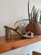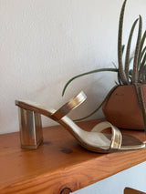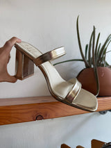 Metallic sandal, not too gold so it doesn't outshine but compliments your outfit. Comfortable heel, perfect with a dress for a special occasion.
