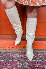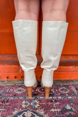 Take your look to the next level with Frankie Cream Crocodile Boot from Chinese Laundry. These stunning tall boots feature a creamy crocodile texture that adds a unique edge to any outfit. Take a walk on the wild side with Frankie!