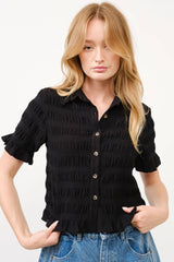 This SMOCKED SHORT SLEEVE BUTTON DOWN boasts a light weight design, smocked detail all over, and ruffled hem sleeves. Perfect for any occasion, this top pairs fashion and comfort effortlessly. Expertly crafted for a flattering fit, this top is a staple in any wardrobe.